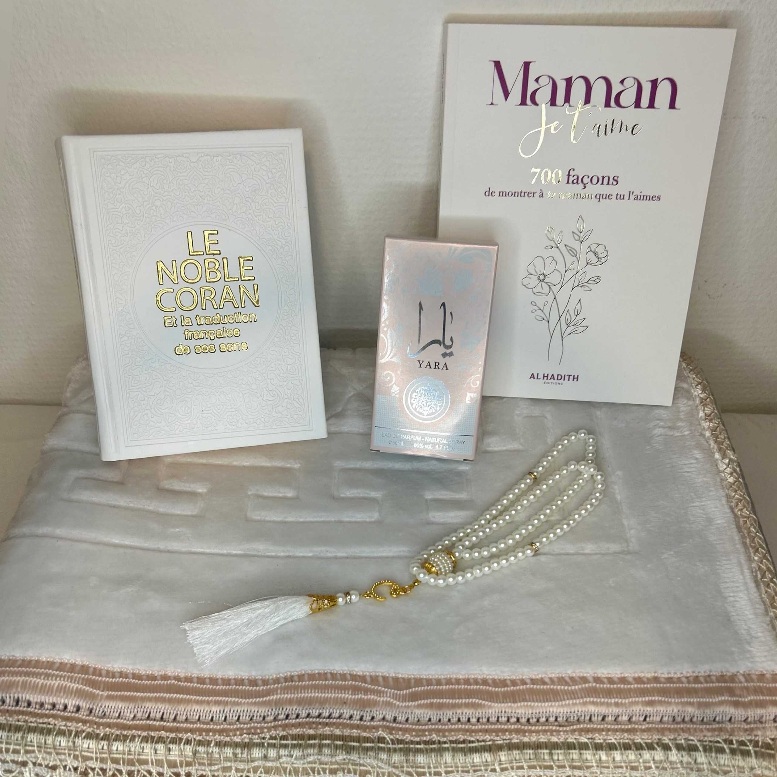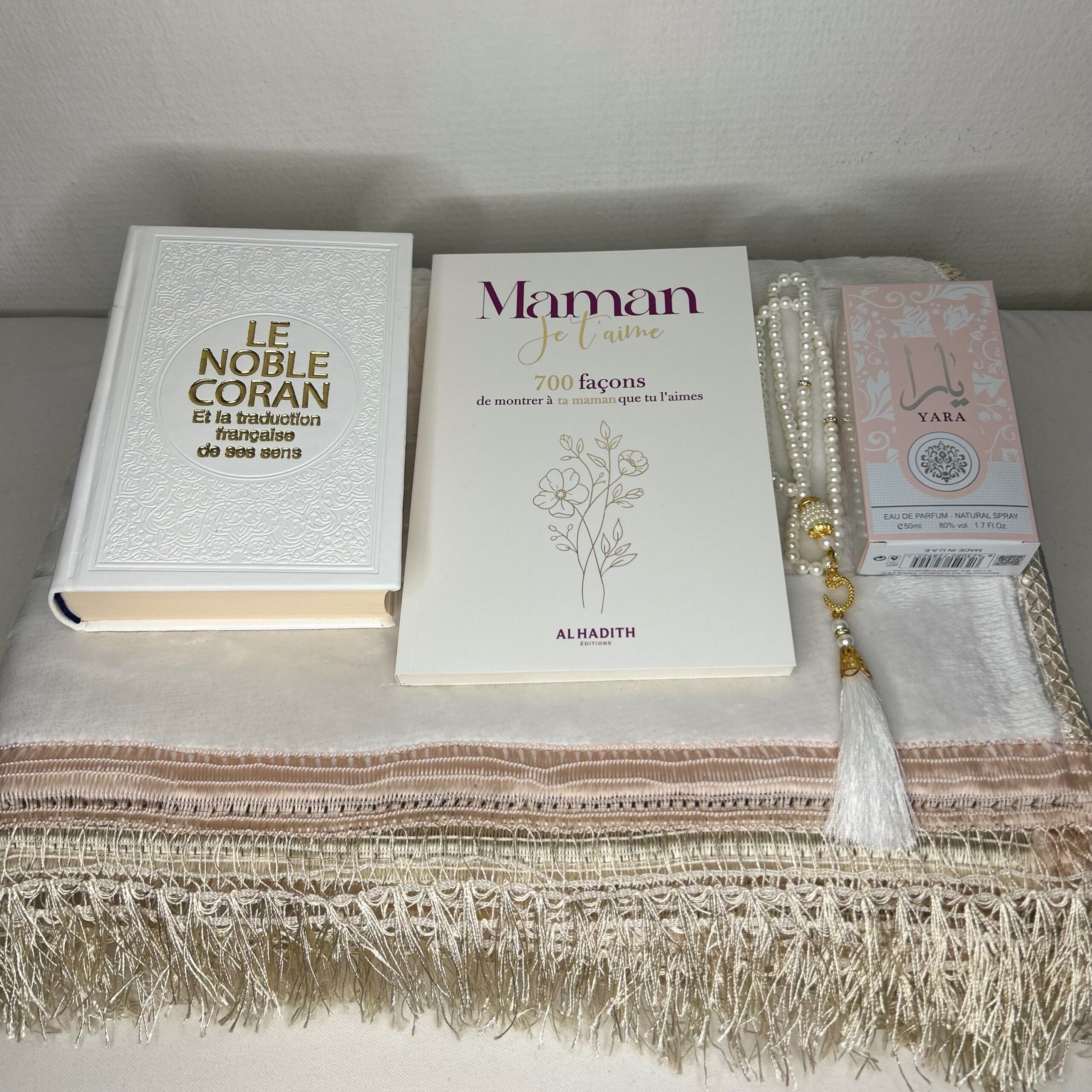 Le “coffret pour Maman” est un ensemble délicatement choisi de produits spirituels et personnels. Il contient un tapis de prière de couleur blanche, symbolisant la paix et la sérénité, qui est essentiel pour les moments de prière. Le tasbih blanc, utilisé pour le dhikr, ajoute à la dimension spirituelle du coffret.
